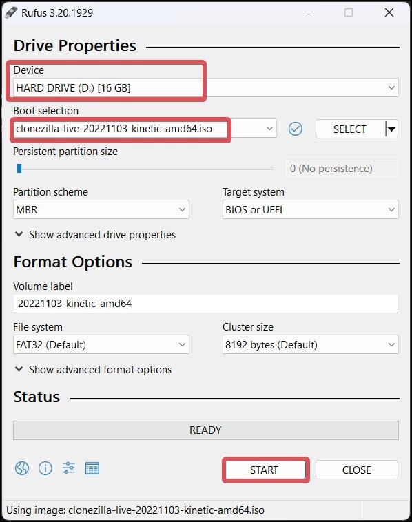 Selecione a unidade USB em a seção Dispositivo. No menu suspenso Seleção de inicialização, escolha Disco ou imagem ISO. Clique no botão Selecionar e localize o arquivo CloneZilla Live ISO. Clique no botão Iniciar.