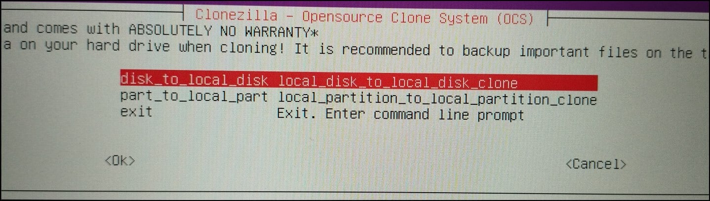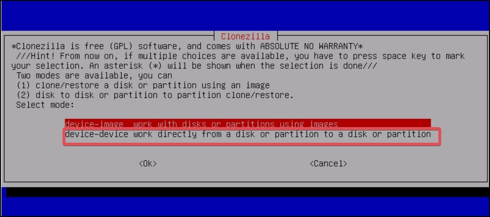 Selecione Iniciar Clonezila. Agora, navegue usando as teclas do seu teclado e selecione a opção dispositivo-dispositivo.