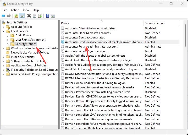Depois de abrir a ferramenta Política de segurança, vá para a pasta”Configurações de segurança/Políticas locais/Opções de segurança”.