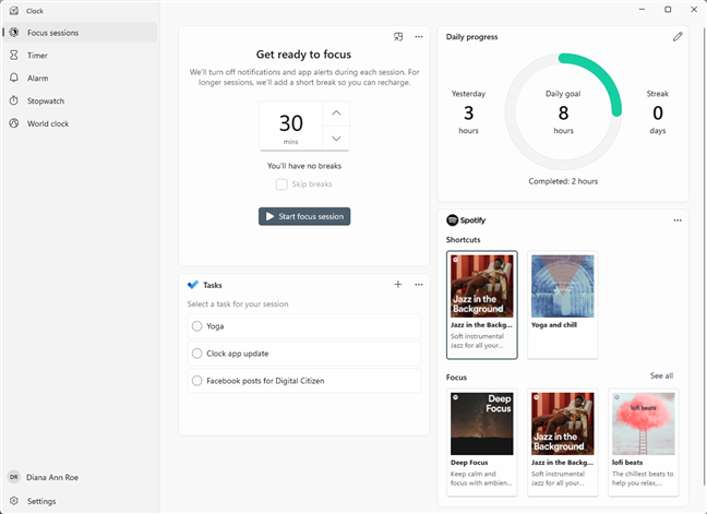 Conecte sua conta do Spotify na guia Focus Sessions do aplicativo Relógio do Windows