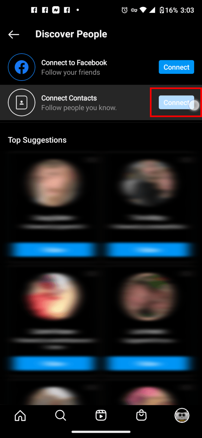 Escolha “Conectar” e permitir que o Instagram acesse seu telefone ou listas de contatos do Facebook. Aqui, você também verá sugestões de perfil.