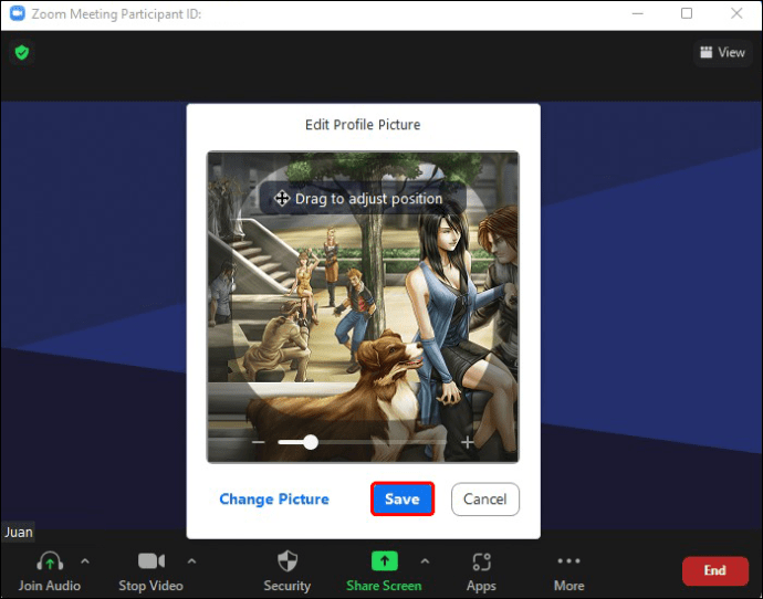 Você pode usar as ferramentas do Zoom para ajustar o tamanho da imagem para que seja exibida corretamente na caixa de imagem. Depois de definir sua foto de perfil, é hora de desativar seu vídeo: