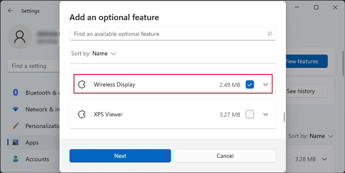 Role para baixo e marque Wireless Display. Clique em Avançar > Instalar.