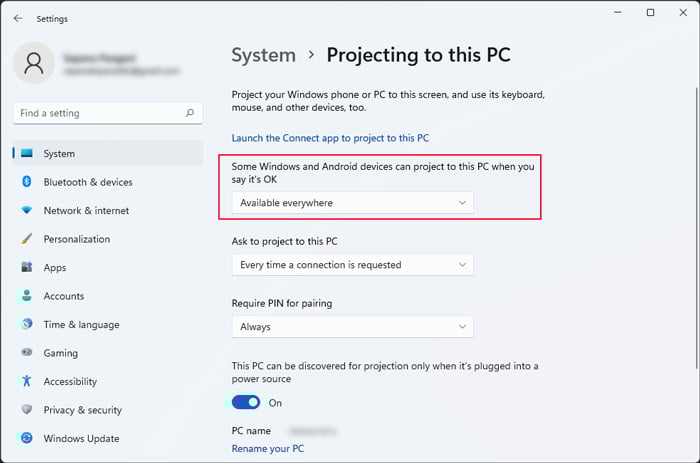 Você pode alterar outras opções conforme sua necessidade. Agora, você pode espelhar a tela de outros dispositivos a qualquer momento neste laptop. Em seguida, clique em Iniciar o aplicativo Connect para projetar este PC. (Da próxima vez, você pode simplesmente procurar por Connect na barra de pesquisa e abrir este aplicativo diretamente.) Anote o nome do seu PC no aplicativo ou nas configurações de’Projetando para este PC’.
