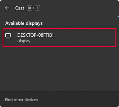 pressione Win + K para abrir a ação Conectar rápido. Selecione o laptop onde deseja espelhar sua tela.