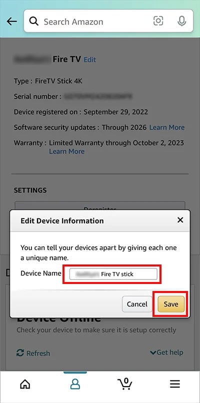 Em Nome do dispositivo, digite Novo nome para seu Firestick e toque em Salvar.