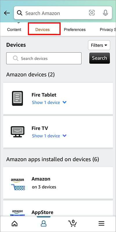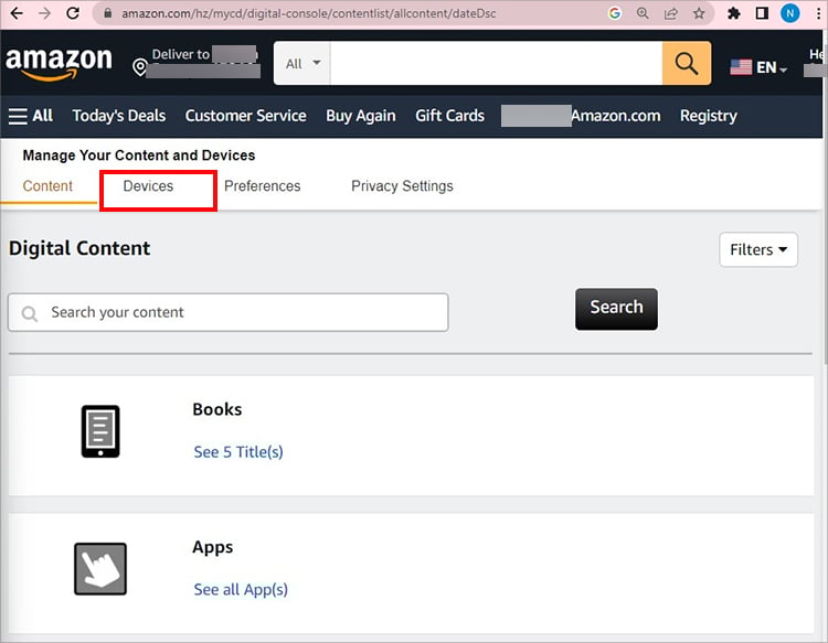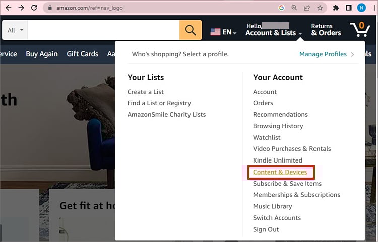 Em um navegador da Web, inicie o site da Amazon. Faça login em sua conta. Passe o cursor sobre o menu Contas e listas no canto superior direito. Escolha Conteúdo e dispositivos.