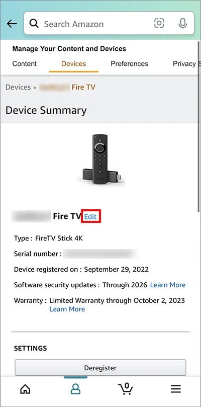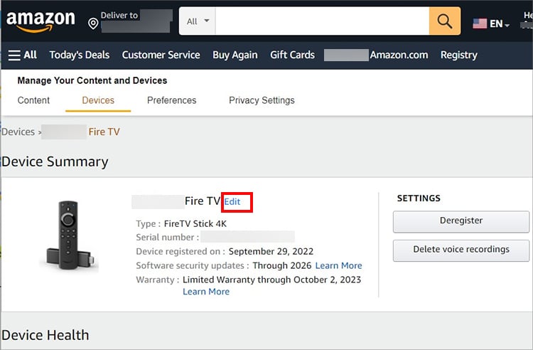 Clique no dispositivo Fire TV stick que você deseja para renomear. Ao lado do Firestick, selecione Editar.