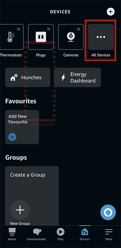 Inicie o aplicativo Amazon Alexa. Faça login na sua conta da Amazon. Toque no ícone Dispositivos na parte inferior.