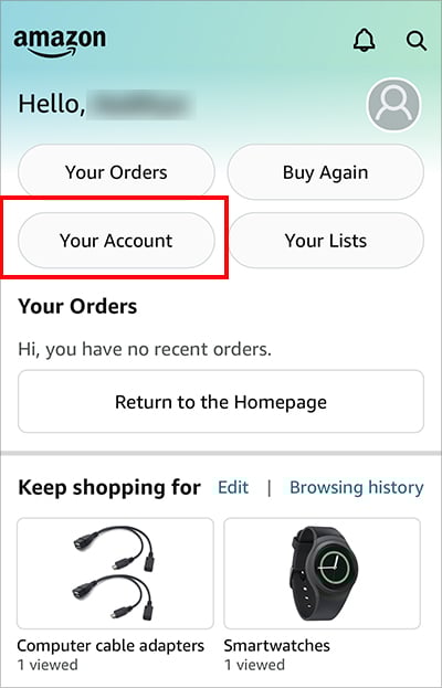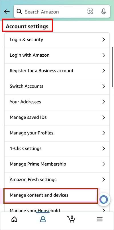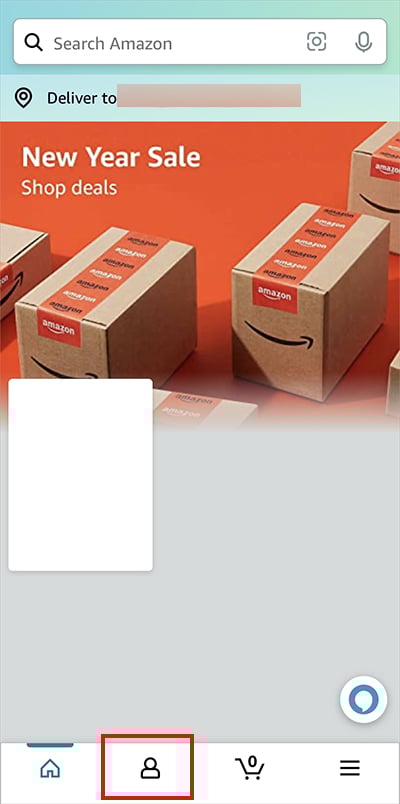 Inicie o aplicativo Amazon Faça login em sua conta. Na tela inicial, toque no ícone Perfil na parte inferior.