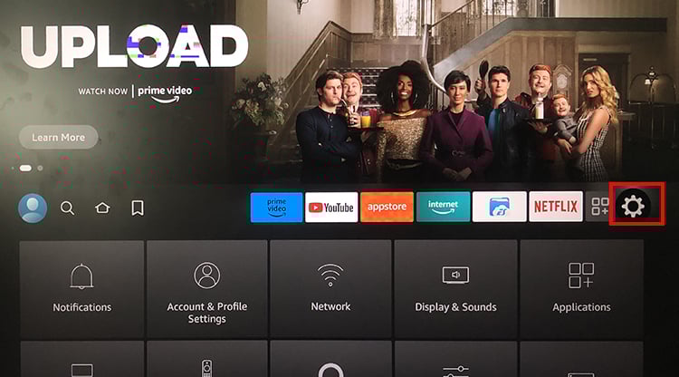 Pressione o botão Início do controle remoto Firestick. No canto superior direito, passe o mouse sobre o ícone de engrenagem para Configurações.