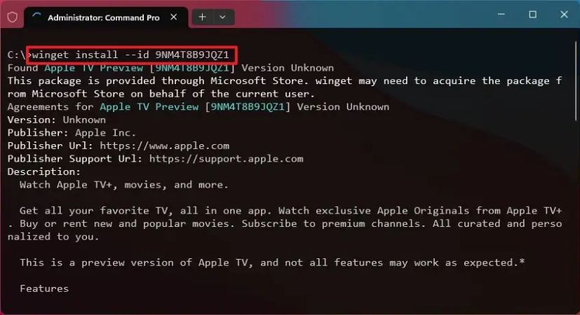 Digite o seguinte comando para instalar o aplicativo Apple TV no Windows 11 e pressione Enter: