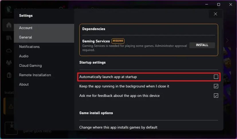Para desativar a opção de inicialização do aplicativo Xbox, abra Configurações do Xbox > Geral. Em seguida, desative a opção “Iniciar aplicativo automaticamente na inicialização”.