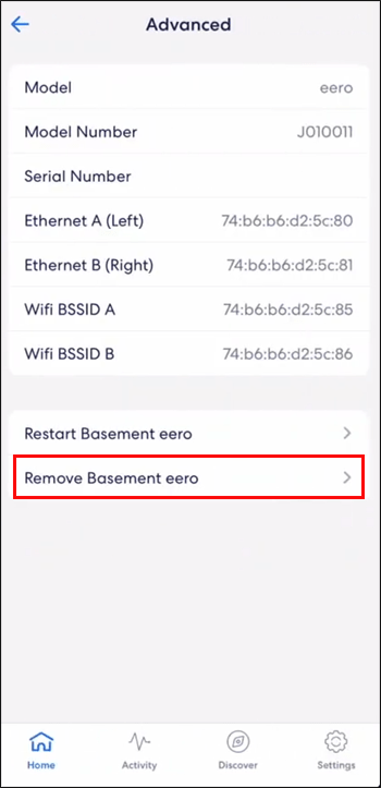 Toque no botão”Remover”com o nome do Eero que você deseja excluir.