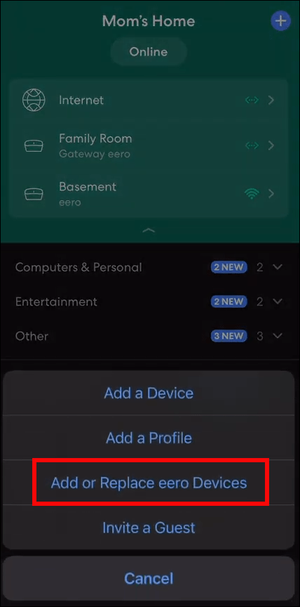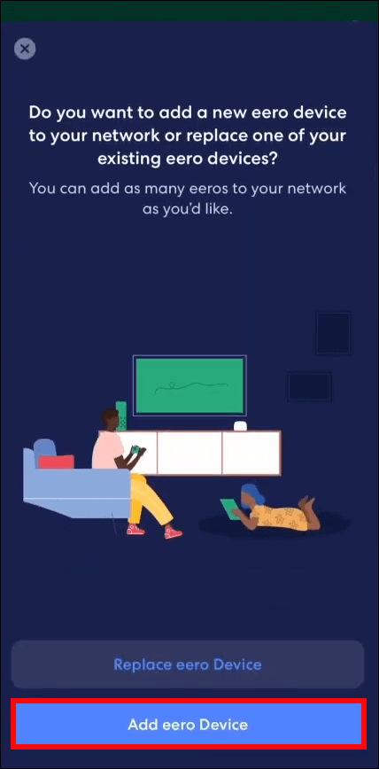 Toque em”Adicionar ou substituir dispositivos eero.”
