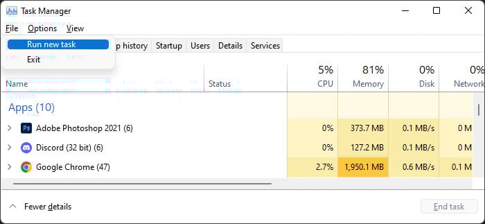 Agora, vá para Arquivo > Executar nova tarefa no menu. Digite explorer e pressione Enter para reabrir o Windows Explorer.