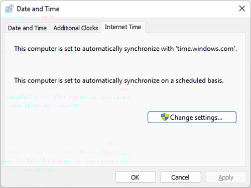 Abra a janela Executar ou Iniciar nova tarefa no Gerenciador de Tarefas. Digite timedate.cpl e pressione Enter para abrir Data e hora. Vá para a guia Horário na Internet e selecione Alterar configurações.