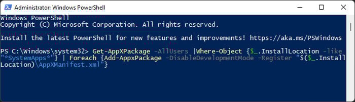 Get-AppXPackage-AllUsers |Where-Object {$_.InstallLocation-like”*SystemApps*”} | Foreach {Add-AppxPackage-DisableDevelopmentMode-Register”$($_.InstallLocation)\AppXManifest.xml”}