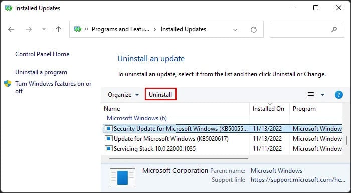 Procure a atualização mais recente (correspondente à hora em que você começou a encontrar o erro). Selecione-o e clique em Desinstalar. Confirme se solicitado.