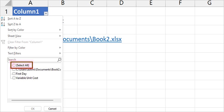 Clique no menu suspenso no cabeçalho da tabela. Desmarque a caixa Selecionar tudo.