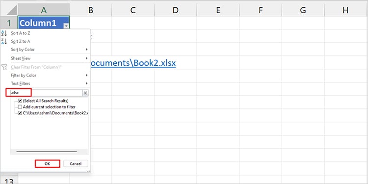 Digite .xlsx na barra de pesquisa e clique em OK.