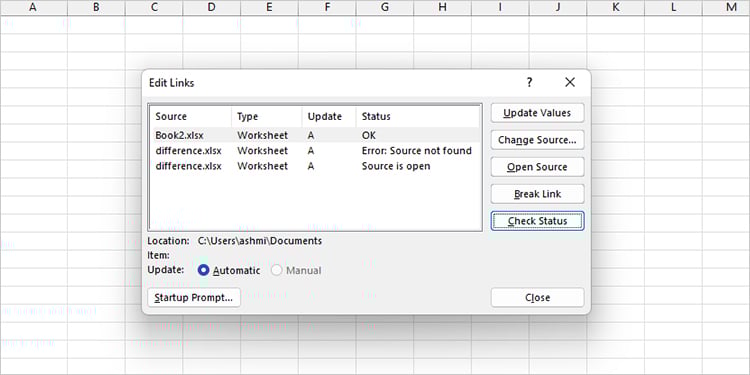 Você pode usar Editar links para visualizar todos os links externos adicionados à sua pasta de trabalho. Isso também inclui links ocultos e quebrados. Todos os links que você incorporou para recuperar dados de gráficos de planilhas externas, gerenciador de nomes e até mesmo uma célula são exibidos na janela Editar links.