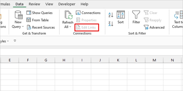 Abra sua planilha. Vá para a guia Dados . Selecione Editar links na seção Conexões.