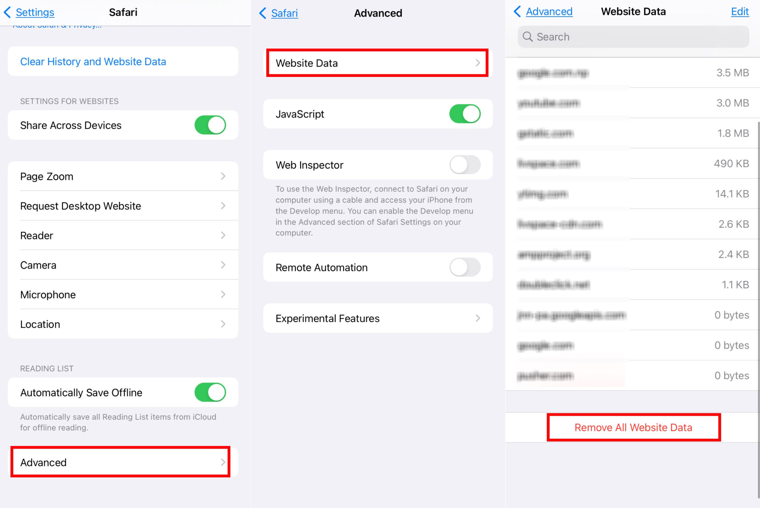 Se você apenas deseja limpar os cookies e manter seu histórico intacto, volte e toque em Avançado. Em outra página, selecione Dados do site. Role até a parte inferior da tela e selecione Remover todos os dados do site.