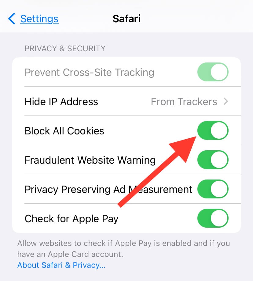 Vá para Configurações e selecione Safari. Role a tela para baixo e ative a opção Bloquear todos os cookies. Toque em Bloquear tudo novamente para verificar.