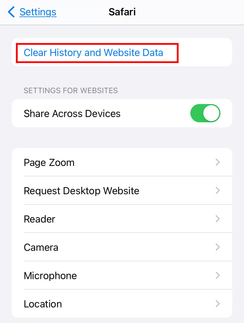 Abra Configurações e vá para Safari. Em seguida, role para baixo e toque na opção que diz Limpar histórico e dados do site. Novamente, toque em Limpar histórico e dados do site para confirmar.