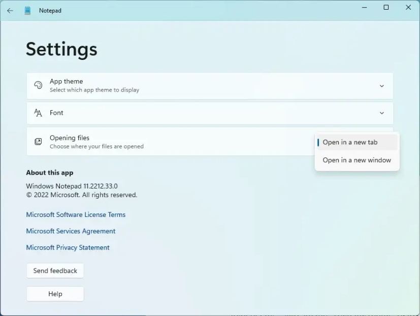 Além disso, no Nas configurações do bloco de notas, há uma nova opção “Abertura de arquivos” que permite escolher onde seus arquivos serão abertos, inclusive em uma nova guia ou nova janela.
