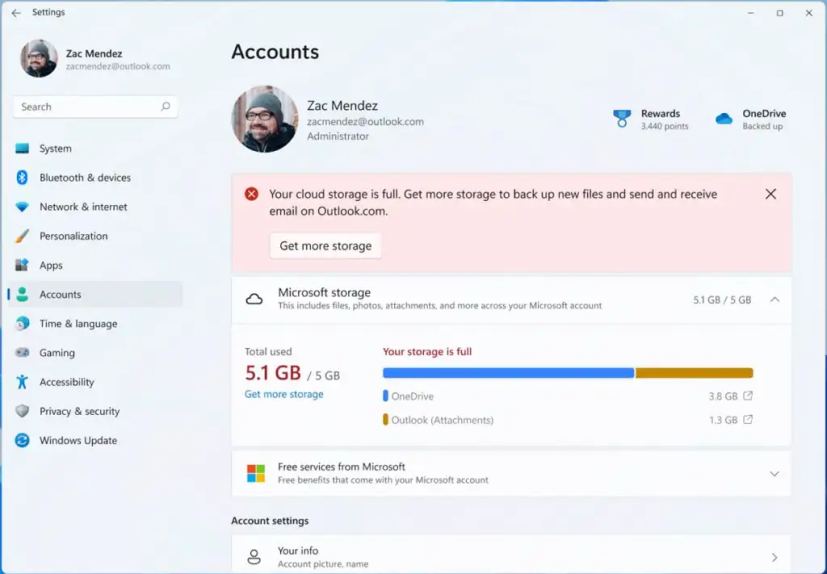 A partir deste voo, o Windows 11 atualiza a seção de configurações”Contas”com elementos visuais para mostrar um aviso de uso de armazenamento conforme você atinge sua cota de assinatura do OneDrive e muito mais detalhes sobre como o armazenamento está sendo utilizado, incluindo anexos do Outlook.