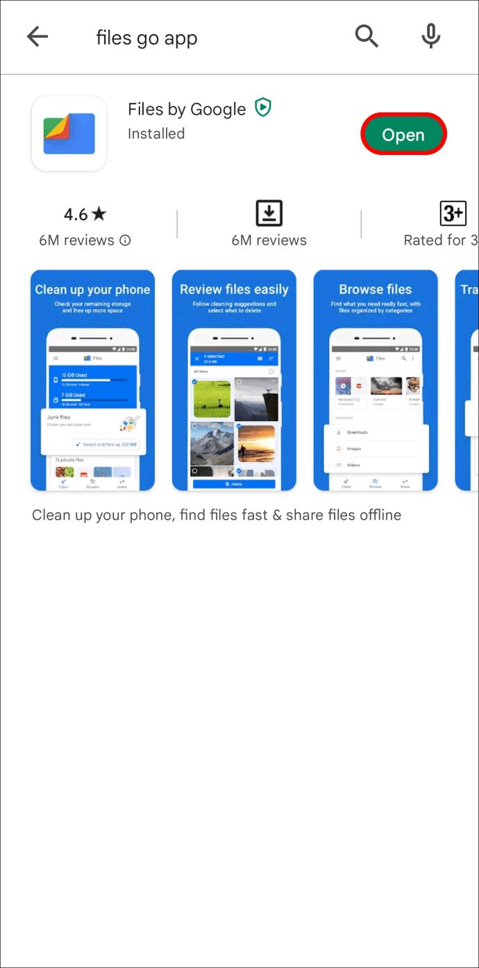 Vá até a Google Play Store, baixe o aplicativo Files Go e”Abra”o aplicativo.