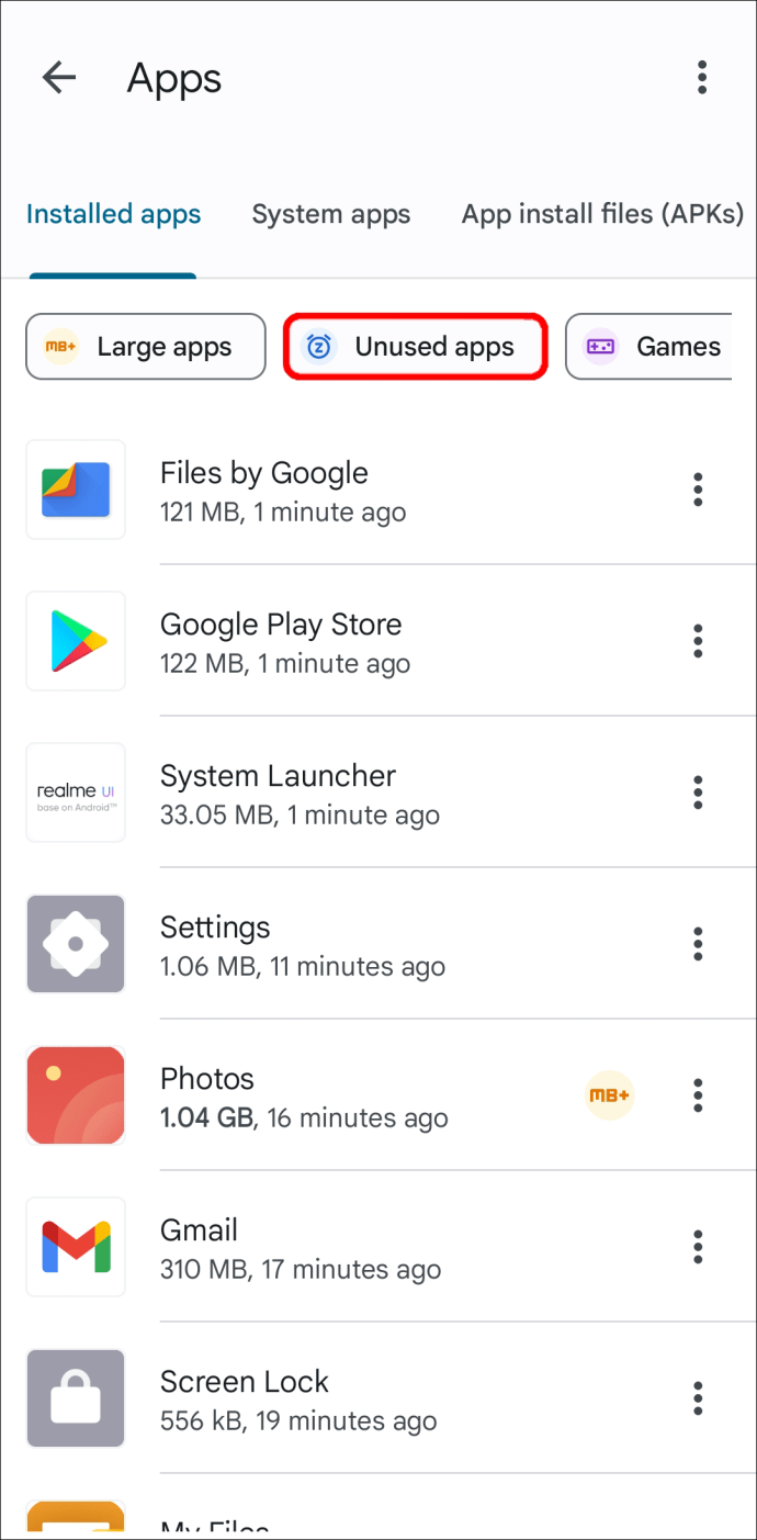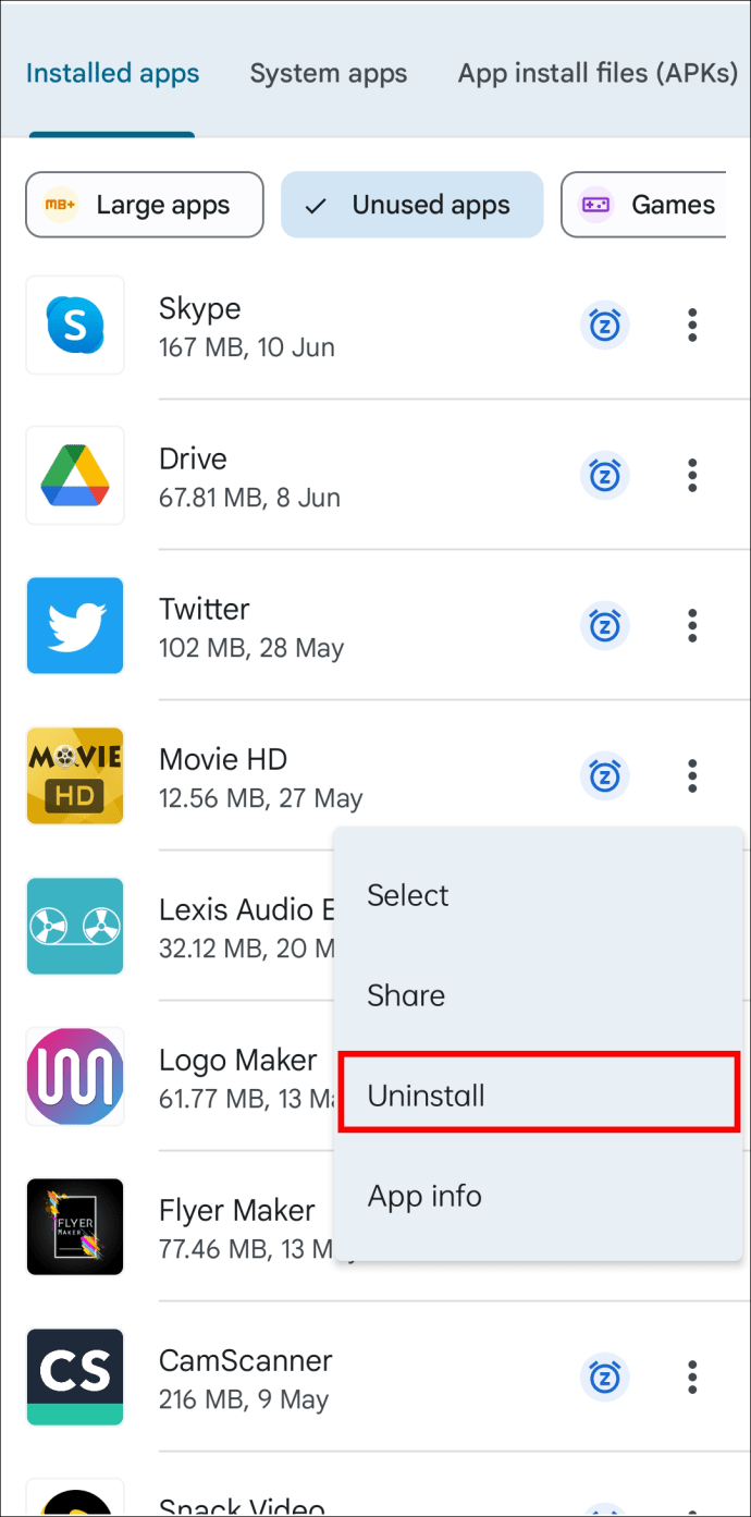 Encontre a seção”Aplicativos não utilizados”.