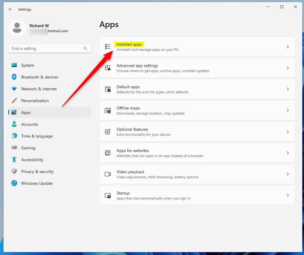 Configurações do Windows 11 aplicativos instalados