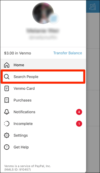 Inicie o aplicativo Venmo em seu Android tocando no ícone Venmo. Vá para o menu principal tocando nas três linhas verticais no canto superior esquerdo. Em seguida, selecione “Pesquisar pessoas.”