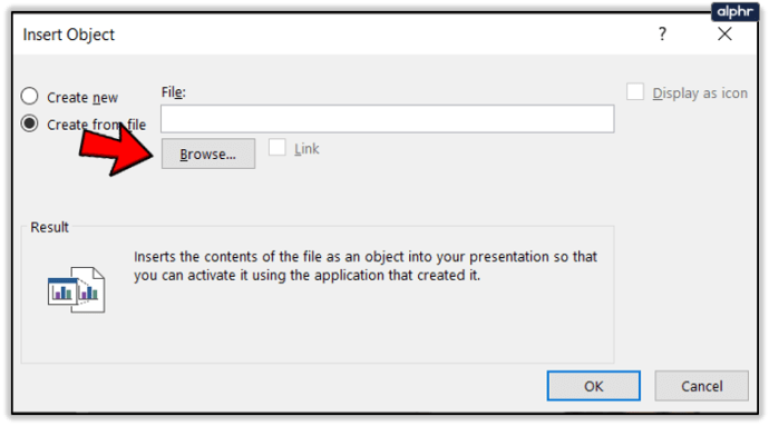 Você verá a caixa de diálogo Inserir objeto. Lá, você deve escolher a opção Criar do arquivo. Você pode inserir o endereço do documento na caixa de texto e pressionar Enter ou clicar no botão Procurar .