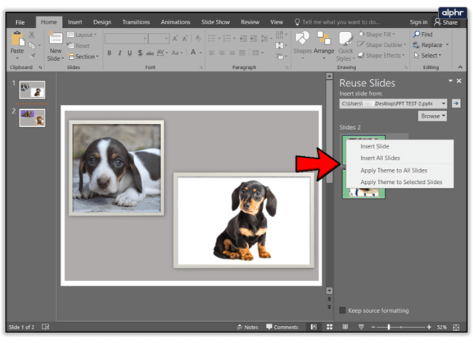 Se você quiser descartar o tema de sua apresentação principal em favor do tema na apresentação externa, você deve selecionar a opção Aplicar tema a todos os slides ao selecionar os slides que deseja inserir.