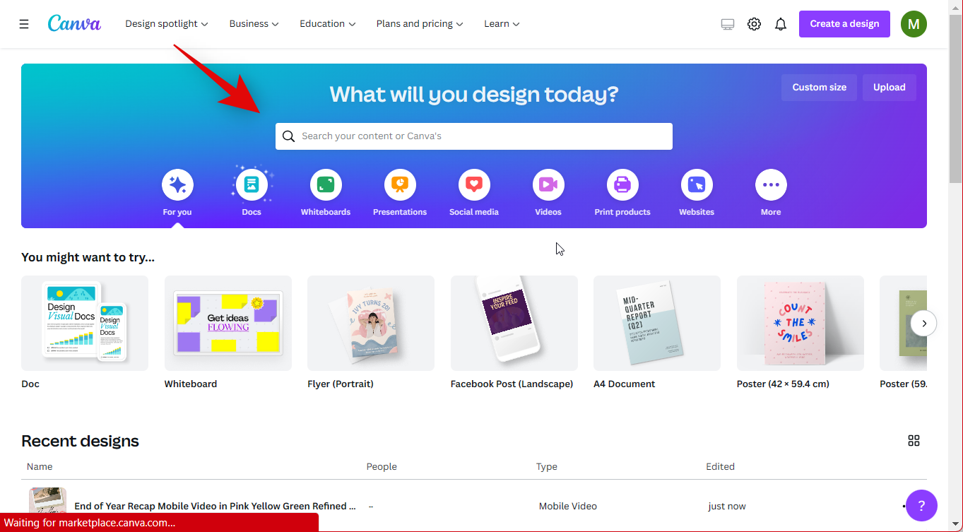 Abra Canva.com no navegador de sua preferência em seu PC e clique na barra de pesquisa na parte superior.