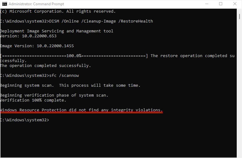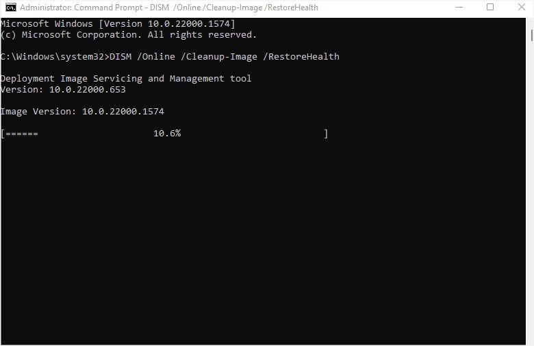 DISM/Online/Cleanup-Image/RestoreHealth Agora, a ferramenta Gerenciamento e manutenção de imagens foi implantada. Isso deve localizar e reparar qualquer corrupção nos arquivos e imagens do sistema.