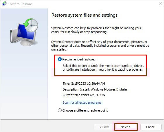 Se você receber o erro após atualizar o Windows, tente desinstalá-lo. Caso não ajude, sugerimos realizar uma restauração do sistema. Isso reverterá seus arquivos e configurações para o estado anterior quando o erro não existia.