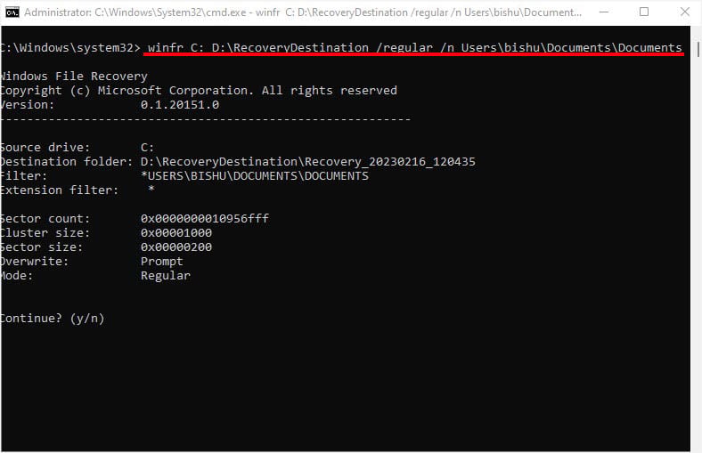 Quando a interface de linha de comando abrir, use a seguinte sintaxe para iniciar o processo de recuperação: