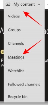 2. Clique em Meu conteúdo e selecione Reuniões no menu suspenso.