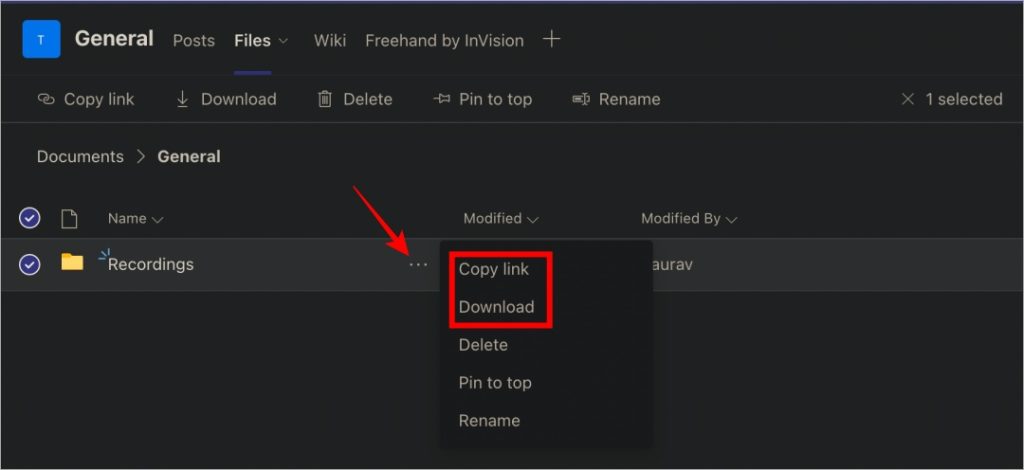Toque no botão menu kebab (ícone de três pontos) ao lado do arquivo de gravação para baixar o arquivo/pasta localmente, compartilhá-lo com outros membros da equipe ou carregá-lo em um aplicativo de armazenamento em nuvem.