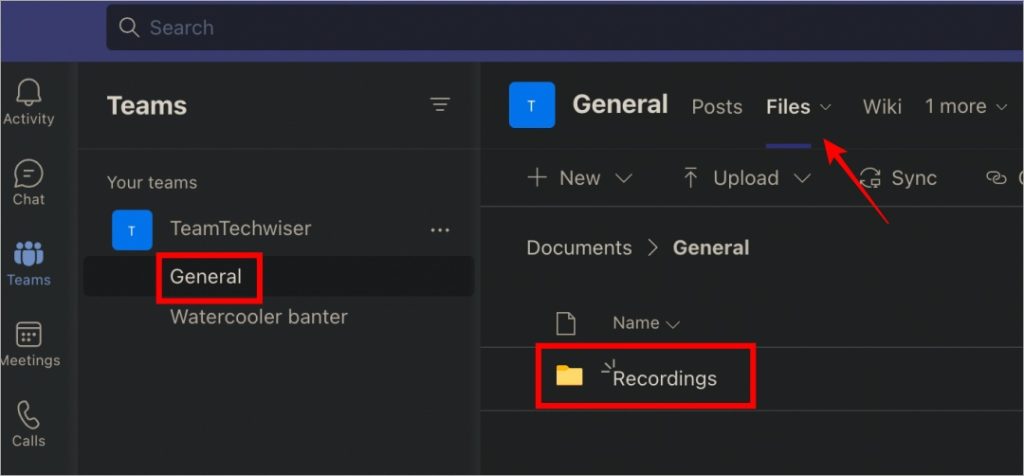 3. Selecione a guia Arquivos na parte superior e clique em Gravações pasta abaixo.