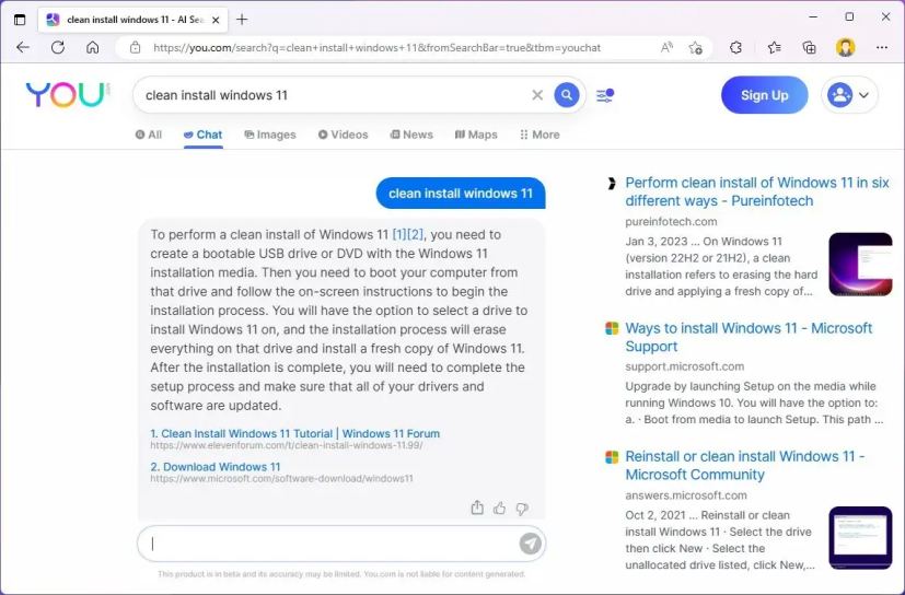 Nas poucas consultas que tentei, as respostas foram bom, mas as informações fornecidas estavam incompletas. Por exemplo, perguntei:”como executar uma instalação limpa do Windows 11?”A resposta estava correta, mas precisava de mais detalhes para concluir a tarefa.