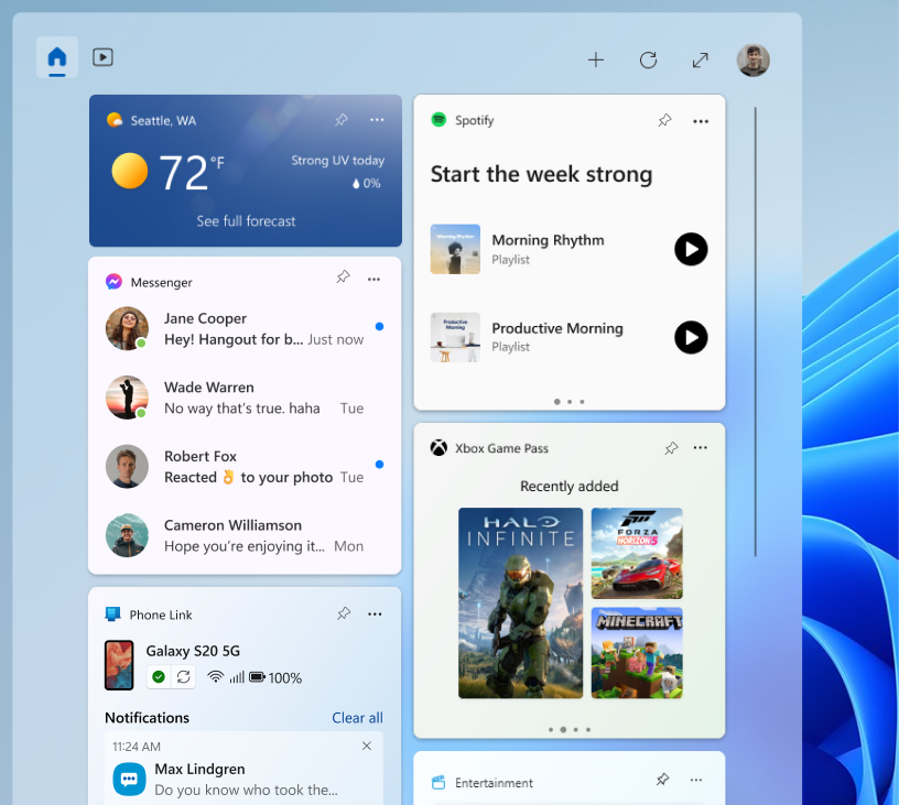 Novos widgets: Messenger, Spotify, Phone Link e Game Pass