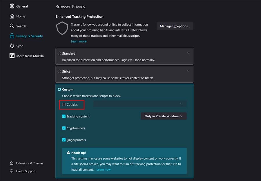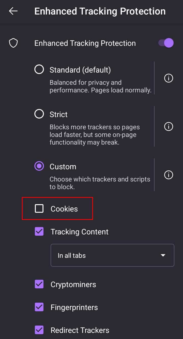 As configurações Padrão e Estrito não bloqueiam biscoitos normais. Eles bloqueiam apenas os cookies entre sites que os sites usam para rastreá-lo em diferentes sites. Se você selecionou as configurações Padrão ou Estrito , pule para a etapa 6. Se você selecionou Personalizado, desmarque a opção Cookies para aceitar todos os cookies.