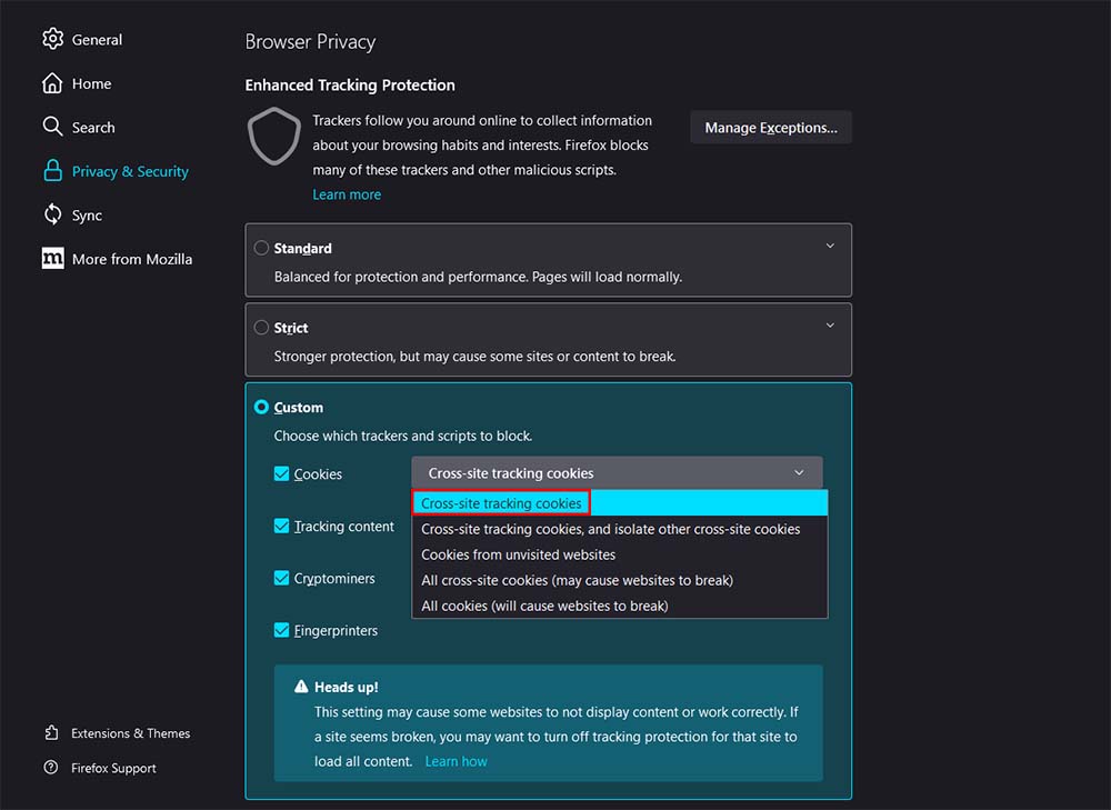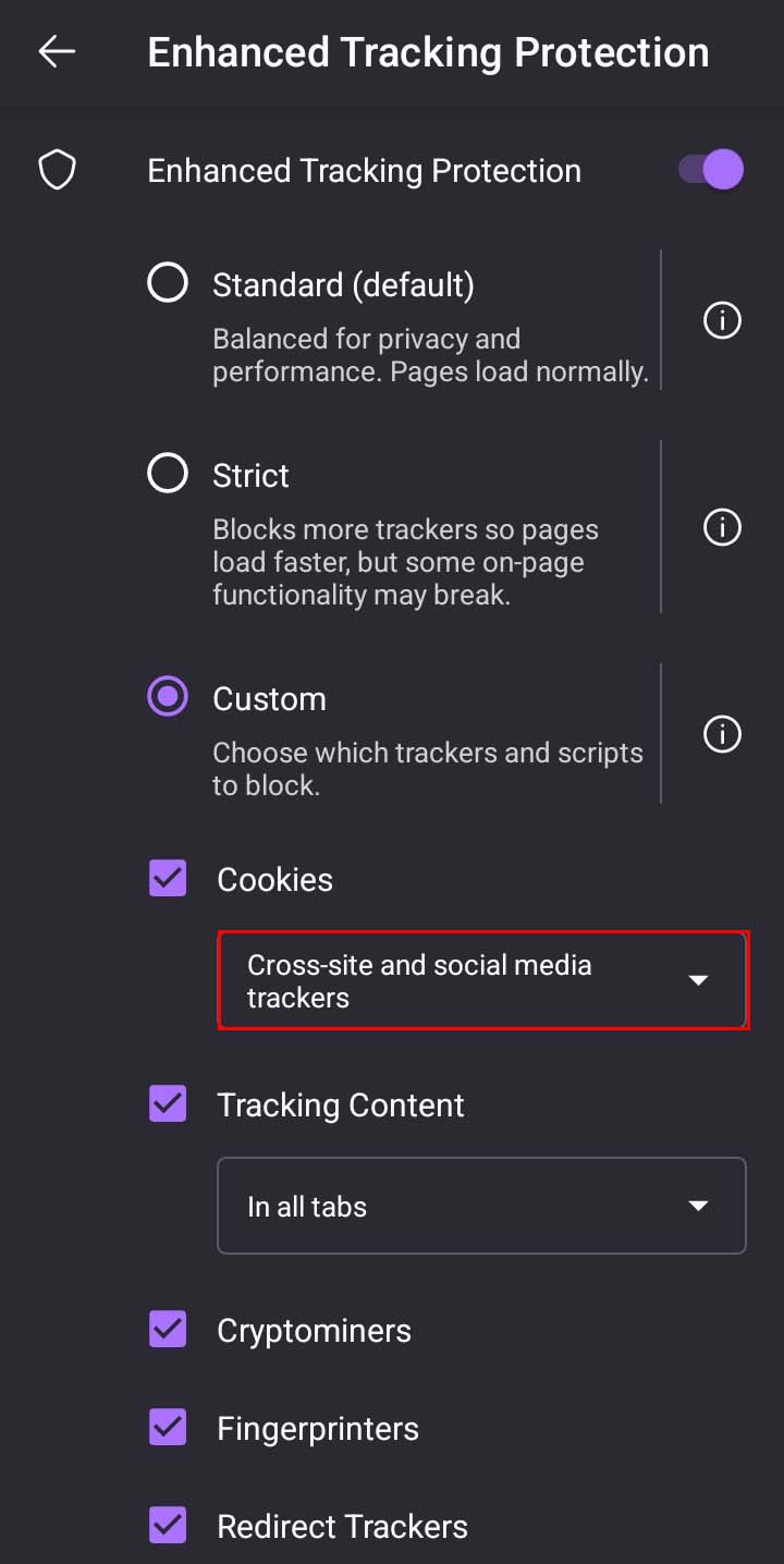 Se você deseja desativar apenas os cookies cross-site, clique no menu suspenso e selecione a opção Cross-site and social media trackers.