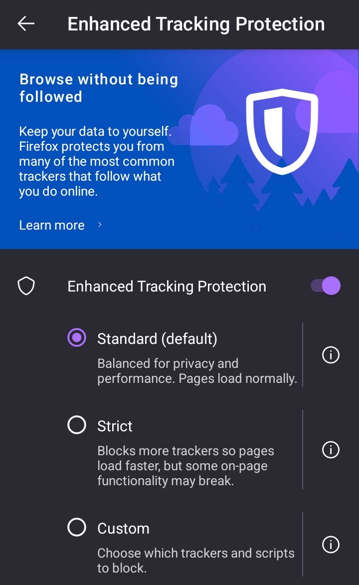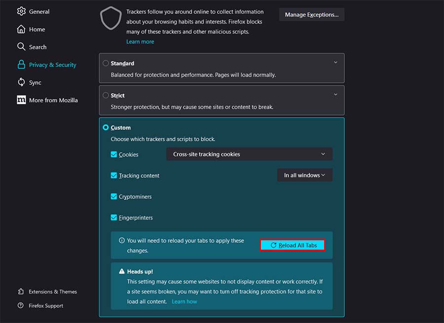 Clique no menu Hambúrguer no canto superior direito para abrir o menu Firefox e selecione Configurações. Vá para Privacidade e segurança na barra lateral esquerda. Em Proteção aprimorada contra rastreamento, escolha uma das três configurações; Padrão, Rigoroso ou Personalizado.